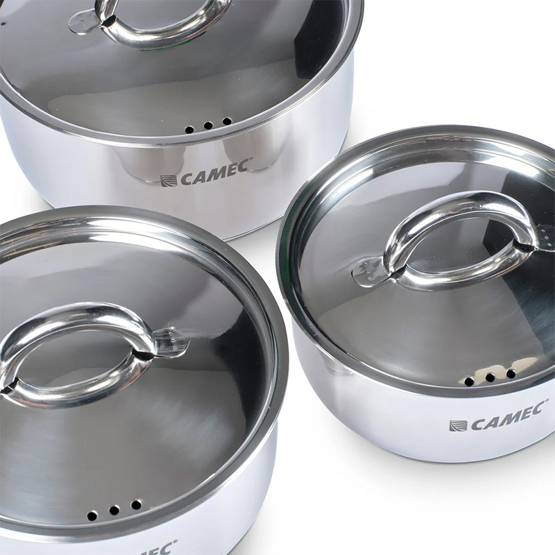 Complete your compact kitchen, with the Stainless Steel Camec Spacesaver Pots and Pan Set.