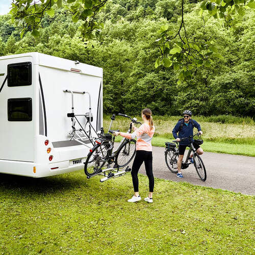 The Thule V16 Bike Rack - Lift Manual allows you to mount your bikes to the rear wall of your RV. The bike rack is light weight and can hold up to 3 bikes (3rd rail must be purchased separately).